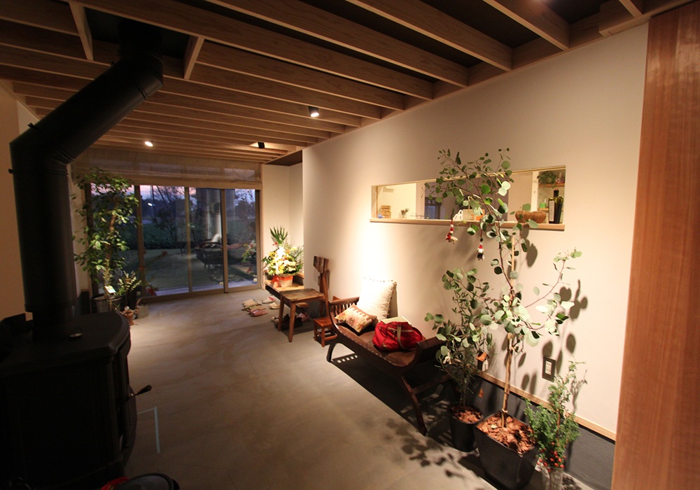 玄関から居室をつなぐ通り土間を設け、軒下空間を暮らしに取り込む設計。