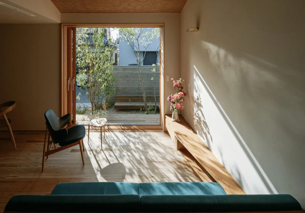 木の建具や框、無垢の床材を使い、畳スペースを通して庭景をつなぐ構成。